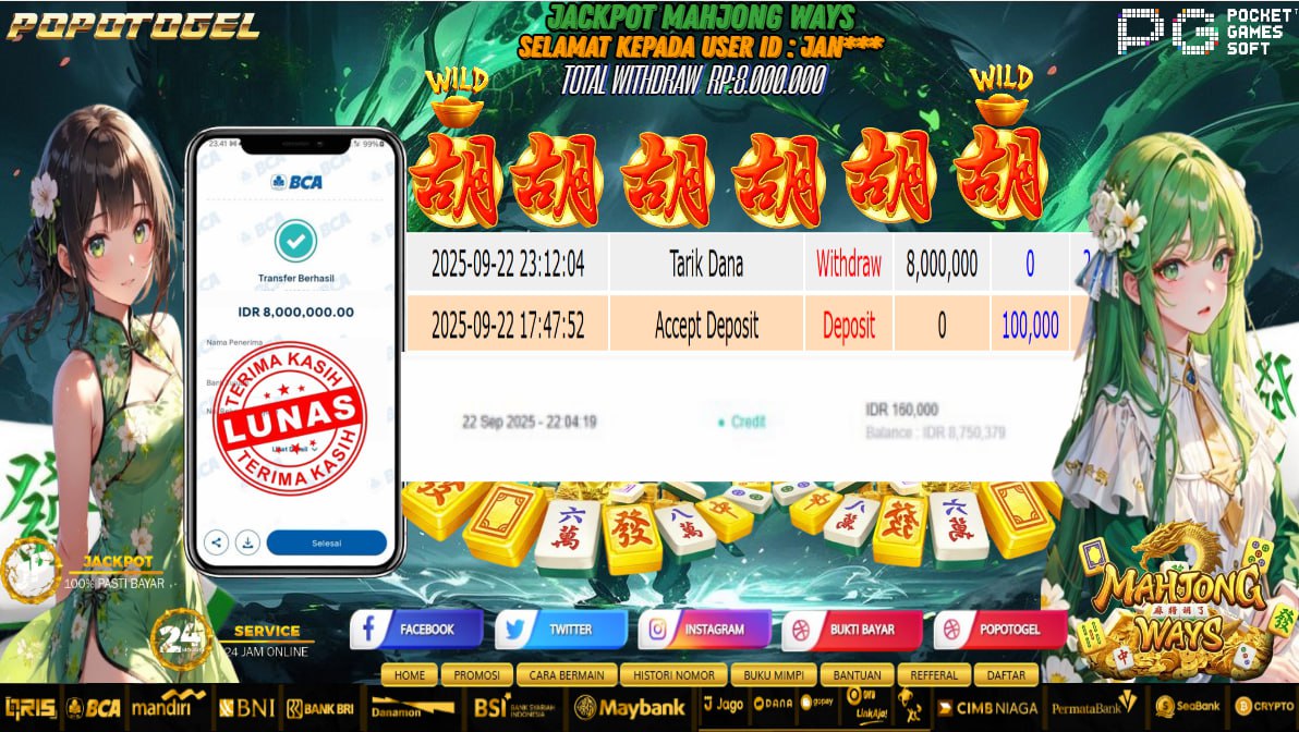 Selamat kepada USER ID :JAN*** Telah berhasil mendapatkan kemenangan besar pada JACKPOT MAHJONG WAYS RP 8.000.000,- LUNAS Setelah mengisi formulir withdraw dengan kurung waktu hanya 5 – 10 menit pihak popotogel sudah melakukan transfer kepada pemilik USER ID dan dana sudah dapat dicairkan oleh pemenang. Bukti pembayaran yang kami berikan merupakan bukti pembayaran yang SAH / VALID yang langung di dapatkan melaui tanda transfer transaksi dari Bank yang dituju.